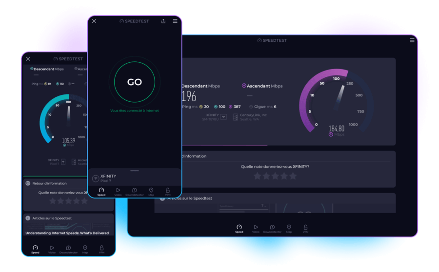 Avec le Speedtest par Ookla®, nous souhaitons rendre l'Internet plus rapide en fournissant des données et des informations concernant les débits réels de l'Internet. Avec des milliards de tests dans le monde, nous venons vers vous où que vous soyez avec des applications pour les appareils que vous utilisez le plus.